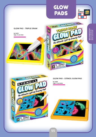 Glow PADS GLOW PAD - TRIPLE DRAW BOX DIMENSIONS: No.3434 Ages :3 and older 24.5 X 29 X5 CM 9.4 X 11.4 X 1.9” GLOW PAD - STENCIL GLOW PAD No.3435 Ages :3 and older 55